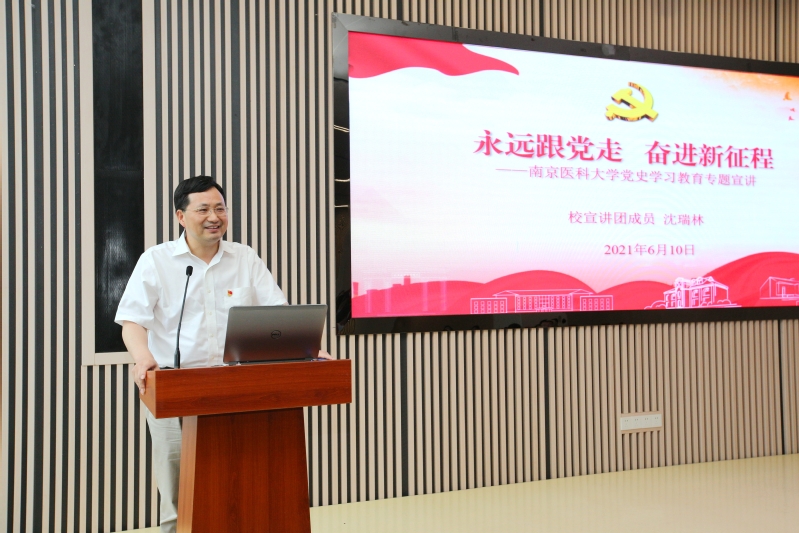 沈瑞林常委以“永远跟党走,奋进新征程”为题,从“为什么”、“学什么”、“怎么学”、“学与行”四个方面讲述了党史学习教育的重要意义、主要内容、方式方法、实践举措。他在宣讲中解读了习近平总书记在党史学习教育动员大会上的讲话精神,梳理了中华民族伟大复兴进程图,从新民主主义革命时期、社会主义革命和建设时期、改革开放和社会主义现代化建设新时期、中国特色社会主义新时代四个阶段,展示出中国共产党回望总结百年奋斗路,来时路指引奋进路的进取历程。沈常委还结合我校红色校史典型事迹,号召大家传承红色基因,争做爱党红医。