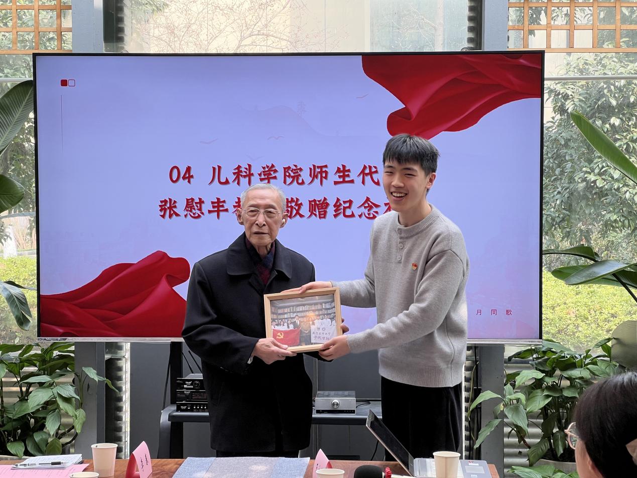 儿科学院组织员倪受文老师借用现代诗《断章》表达了对儿科精神传承的感触与赞叹,提出要不断传承儿科前辈的为人为学风范,不断促进儿科学子全面发展、茁壮成长。儿科学院本科生党支部副书记王立成同学代表青年学生向张慰丰教授表达了感谢,表示要以颜老和张老为标杆,在新时代潜心学习、珍惜来之不易的丰富资源,在医学实践中挺膺担当。