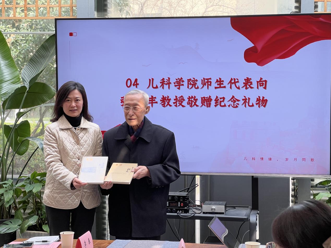 为表达对张慰丰教授的敬意和感激之情,儿科学院师生精心准备了一份纪念礼物——守民学社2023年首期真人图书馆于慰丰书斋合影相片、南京医科大学90周年校庆纪念文集、儿科文创纪念台历。在热烈的掌声中,师生代表将这份心意送到张教授手中。
