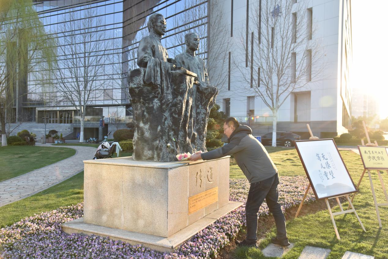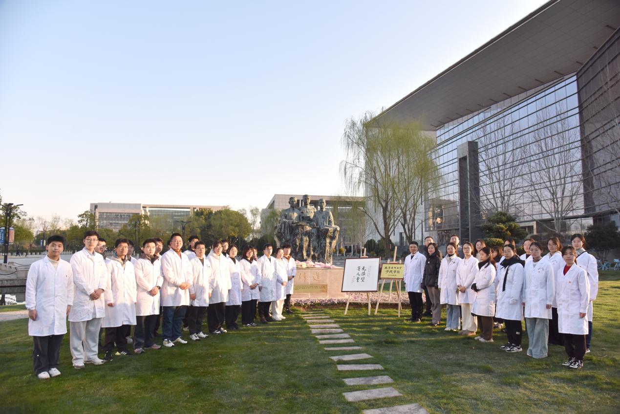 晨光中,师生一同聚集在颜守民雕像前。学生代表俞玮奕分享了与颜老学生张慰丰教授的访谈心得。敦煌俊秋老师向大家展示韩济生院士的亲笔书法“无限望 寄儿童”。张爱华院长阐释他心中的儿科精神,希望儿科学院全体学生更加脚踏实地走好行医路上的每一步。师生向“传道”雕像献上一束束康乃馨,鲜花迎着晨光,守民学子在缅怀中铭志。