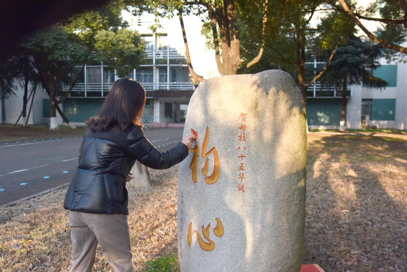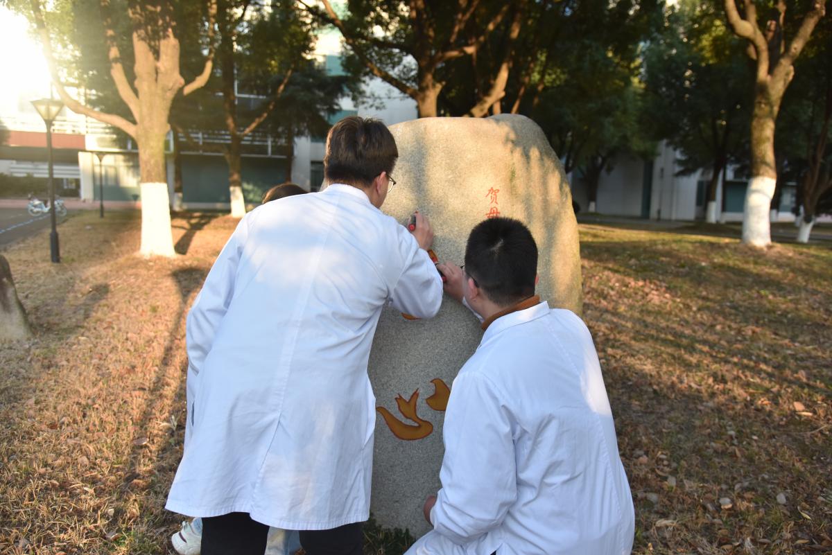道路的另一侧,“初心”石在晨曦中伫立。2019年,儿科校友向母校捐赠“初心”石,展现全体儿科人“尽心守护儿童健康”的初心誓言和对母校的祝福。6年后的今天,新一代的儿科师生怀着同样的“初心”,在石上描红。“初心石”再次焕发光彩,儿科初心永不褪色。