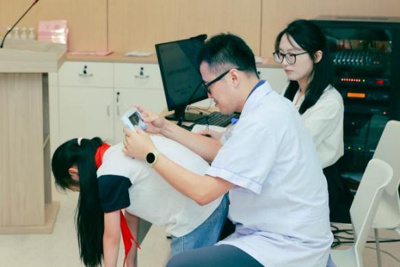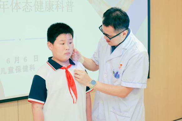 接着,康复科宋骏医生带来了一堂深入浅出的“脊柱健康课堂”,讲解正确坐姿、站姿的重要性,并为20名学生逐一进行体态筛查,此外,生动有趣的体态操吸引了全场师生的兴趣,大家在宋医生的带领下舒展身体,活动筋骨。