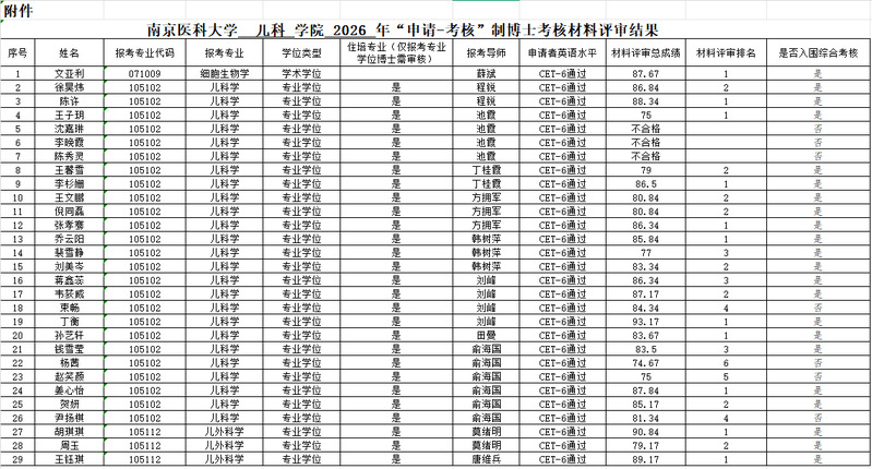 根据《南京医科大学博士研究生招生“申请-考核”制实施办法(2024版)》《南京医科大学2026年全日制博士招生“申请-考核”制报考须知》和《南京医科大学儿科学院2026年博士研究生招生“申请-考核”制实施细则》要求,经学院材料初审、导师评审和专家评审,现将入围综合考核的申请者名单公示如下: