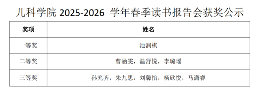 以读书启智,以书香润心,以阅见成长。本次读书报告会虽已圆满落幕,但儿科学院学子的阅读之路仍在继续延伸。愿全体儿科学子将阅读融入日常、化为习惯,在人文典籍中涵养初心,在专业书卷中精进医术,把读书所得的感悟与担当化作从医路上的不竭动力,怀仁心精研医术,秉初心守护生命。