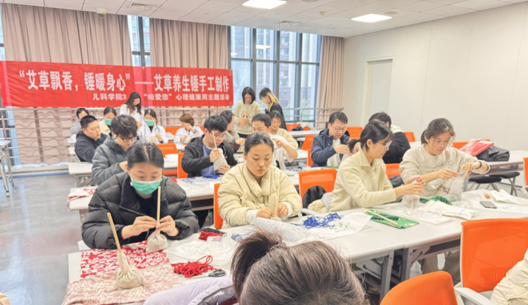 为缓解课业繁忙的压力,在3月16日中午,儿科学院本科生和研究生联合举办了“艾草飘香,锤暖身心”艾草养生锤手工制作活动。在此次活动中,本科生志愿者向研究生们讲解艾草锤的历史渊源、核心功效、养护方法,教学艾草锤的制作方法,讲述制作过程中的常见失误。制作完成后,老师们和同学们互相欣赏作品,用艾草锤敲打酸痛的肩背大腿,以温和艾香缓解疲惫。我们希望,同学们每天都能像今天这样放松身心,不仅增长了知识,也让健康心理茁壮生长。